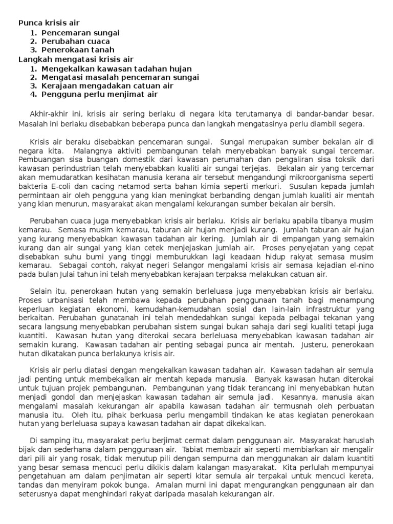 Semoga perkongsian bahan-bahan rujukan panduan bahan pembelajaran dan pengajaran contoh-contoh karangan sumber rujukan STPM Sijil Tinggi Persekolahan Malaysia tingkatan 6 dalam post di blog Bumi Gemilang berguna. Jika dikalkulasi satu dari empat orang di dunia kini kekurangan air minum. V Kerajaan perlu mengadakan catuan air ke kawasan-kawasan tertentu sebagai langkah berjaga-jaga.